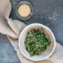 - Roast the sesame seeds in a frying pan and sprinkle over the spinach.